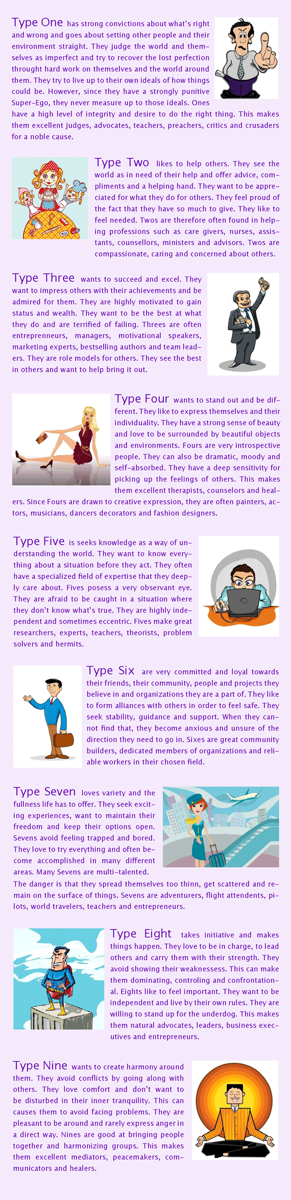 The following cartoons and short descriptions of the 9 Enneagram Types highlight chief features that are often found in representatives of that type. However, they are not meant to create stereotypes. They are for the purpose of introducing a very complex field of study: the personality types. Not all members of a type share the same dominant features equally. There are more factors within the Enneagram system that contribute to a person’s multifaceted personality. For the sake of simplicity we only focus on a few main personality traits here. There are members of each Enneagram Type in both genders and in all professions. As a general rule, people are more drawn to professions in which they can use the natural gifts of their type.